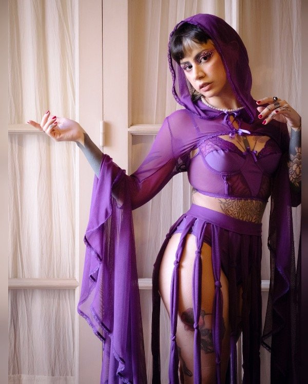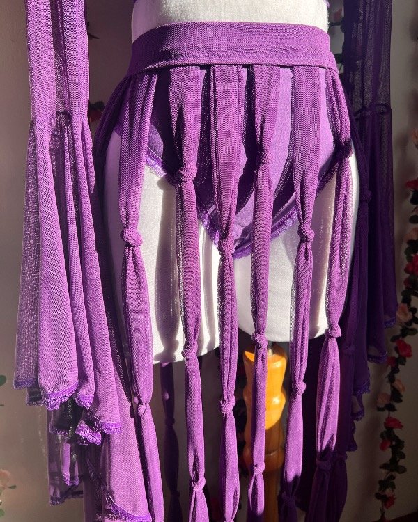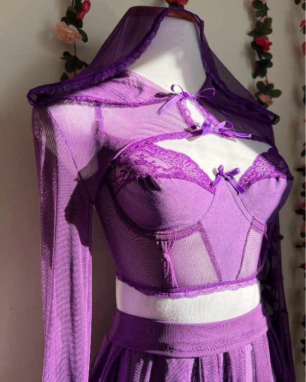 ❁ Detalles: Manguitas princesa con capucha amplia de microtul y puntilla + bustier taza media con breteles regulables y un broche de 6 cm detrás + pollera larga anudada de microtul y una bombacha tiro alto vedettina de tricot y puntilla
